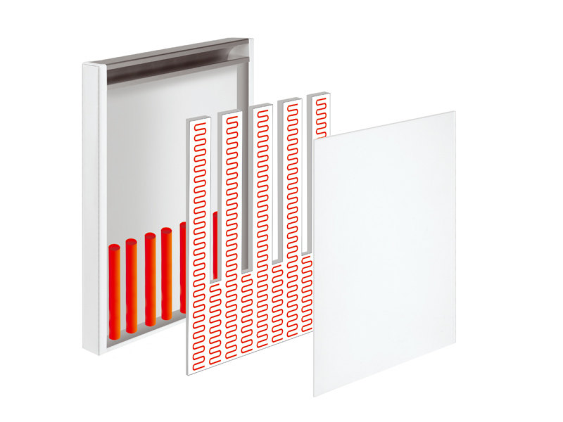 - Drugi grelec je uporovna etched-folija, ki je nameščena na sprednjo stran radiatorja. Ta dva grelca sta upravljana preko elektronike radiatorja, ki po potrebi vklaplja grelce, tako da zagotavlja maksimalno udobje in hkrati čim nižjo porabo.