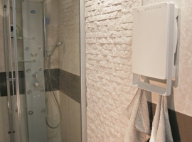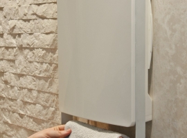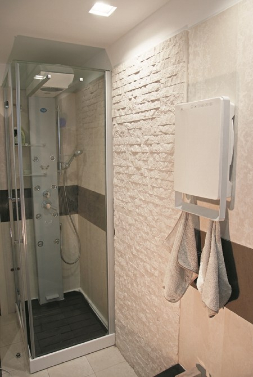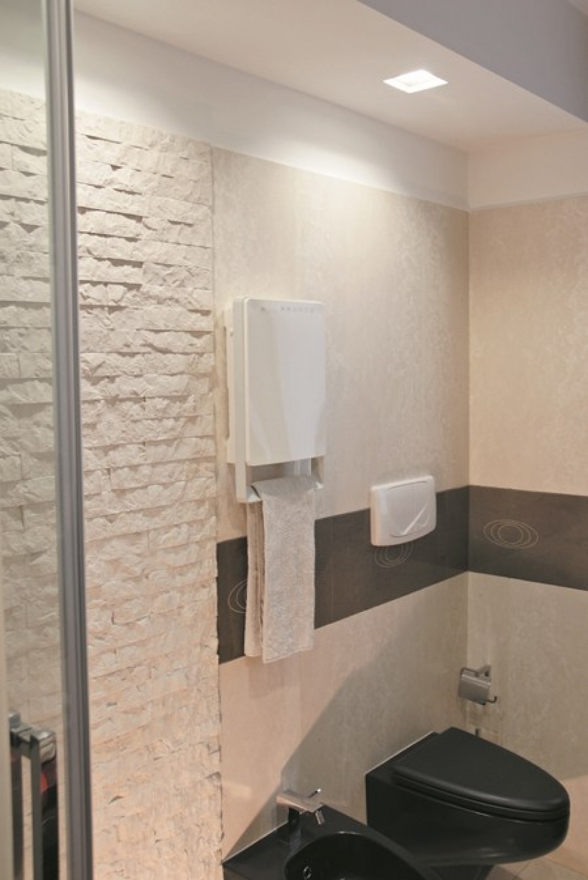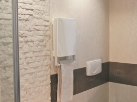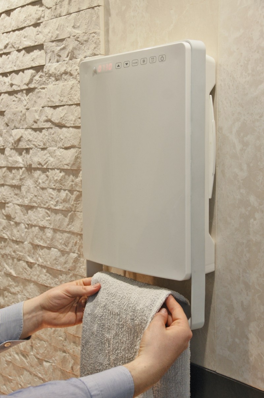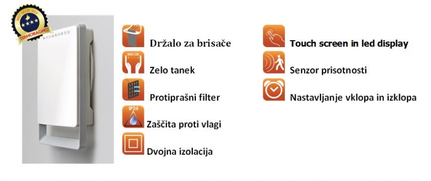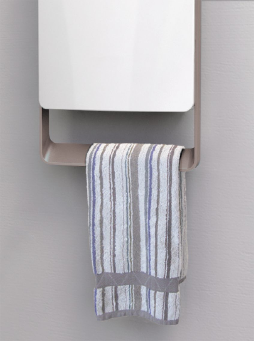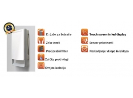 ki v le 11 cm združuje grelnik in sušilec brisač. Ta inovativni grelec s svojo napredno tehnologijo zagotavlja maksimalno udobje in hkrati varčevanje z energijo. To mu omogoča vgrajen senzor prisotnosti, ki samodejno poskrbi, da ko v kopalnici ni nihče prisoten, samodejno preide v ekonomičen način delovanja (3,5° C manj od nastavljene) in samodejna regulacija moči ogrevanja (od 0W do 1800W). Dodatno udobje za uporabnika prdestavlja tedenski časovnik s katerim si uporabnik lahko nastavi željeno temperaturo. Grelnik je opremljen tudi s protiprašnim filtrom in držalom za sušenje brisač.